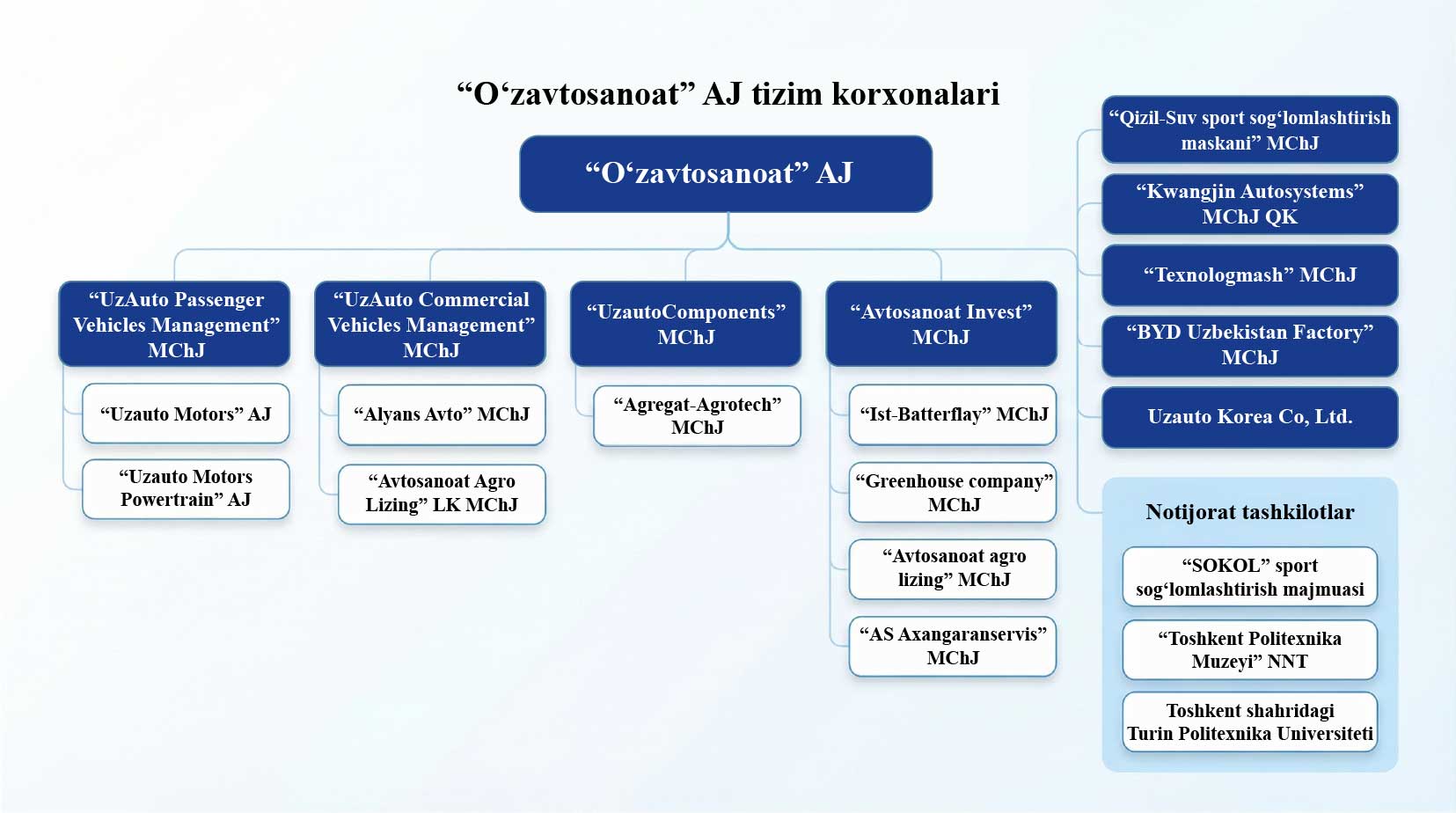 100 dan ortiq, shu jumladan sub yetkazib beruvchilar. Asosiylari — "UzAuto Motors Powertrain" AJ, “Uz-SaeMyung Ко”AJ, «Uz Koram»,«Uz Koje» «Avtokomponent», «Uz Dong Yang», «Uz Hanwoo», «Uz Dong Won Ko», «Uz Dong Ju Paint», «Uz Tong Hong Ko», «Uz Chasis»,«Uz Sangwoo», «O`zAuto Austem», «Uz Minda», «Jizzax Akkumulyator Zavodi», «Uzeraealternator», «Uzerae Climate Control», «Uzeraeacable», «Uz Hanwoo Engineering», «Kwangin Autosystems», «Avtooyna» va boshqalar.