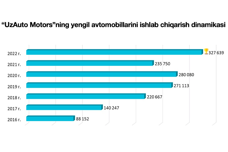 Ishlab chiqarish jarayonlarining optimallashuvi hamda modernizatsiya qilinishi hisobiga, UzAuto Motors kompaniyasi tarixiy rekordni o’rnatishga erishdi ya’ni 2016 yildan buyon ishlab chiqarish hajmi 269 %ga o‘sgan. Ishlab chiqarish jarayoniga yangi texnologiyalarning tadbiq etilishi, uskunalarning yangilanishi va kadrlar malakasining oshirilishi Markaziy Osiyoda yetakchi hisoblangan “UzAuto Motors” kompaniyasini MDHda gigant avtomobil ishlab chiqaruvchisiga aylantirdi.