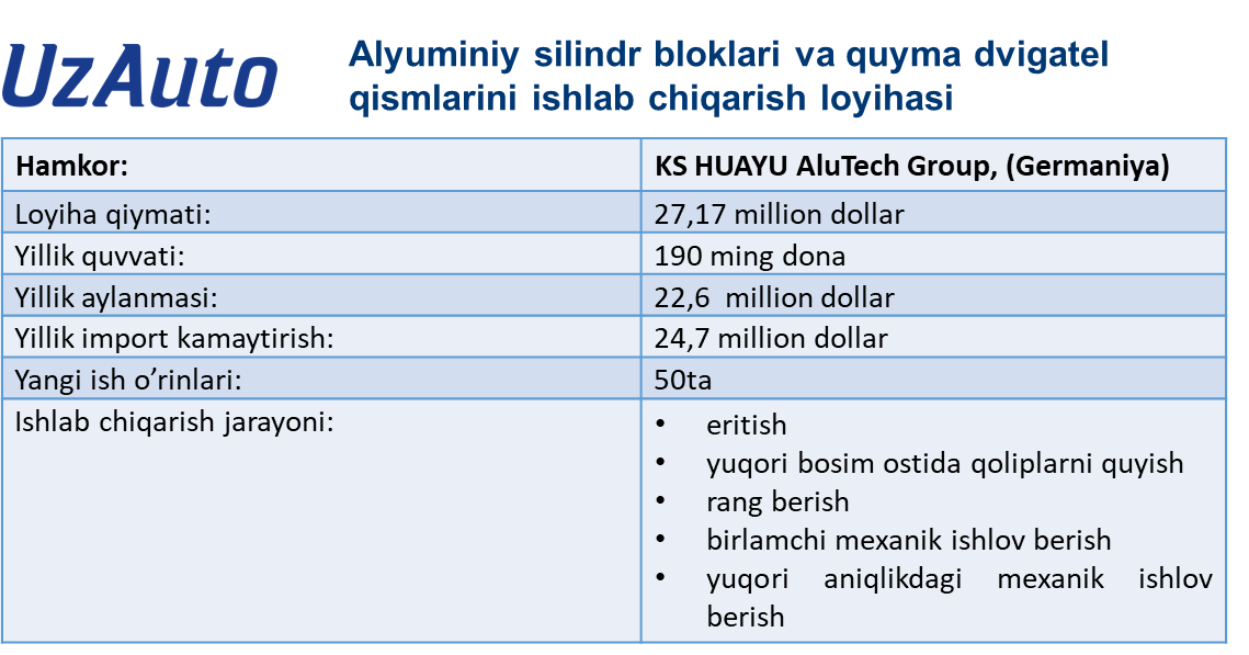 Alyuminiy silindr bloklarini ishlab chiqarishni to'liq siklda tashkil etish loyihasining umumiy qiymati 27 million dollardan ortiq bo’lib, uning yillik aylanmasi 22,6 million dollarni tashkil etadi. Qo'shimcha 1540 kv.m. ishlab chiqarish maydoni. Shuningdek, loyiha doirasida korxonada qo‘shimcha 50 ta ish o‘rni yaratiladi. Yiliga 190 ming dona mahsulot ishlab chiqarish quvvatiga ega zamonaviy quyuv hamda detallarni yuqori aniqlikdagi qayta ishlash sexini tashkil etish uchun “UzAuto Motors Powertrain” AJga qo’shimcha yana 1 540 kvadrat metr maydon ajratiladi. Shuningdek, loyiha doirasida korxonada qo’shimcha 50 ta ish o’rni yaratiladi.
