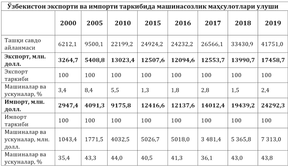 Что касается анализа внешнеторгового оборота Узбекистана, где автор статьи показывает, что за последние 20 лет доля автомобилей и машиностроительного оборудования в общей структуре импорта остается на уровне 35-40%, то он, увы, ничего кроме удивления не вызывает.