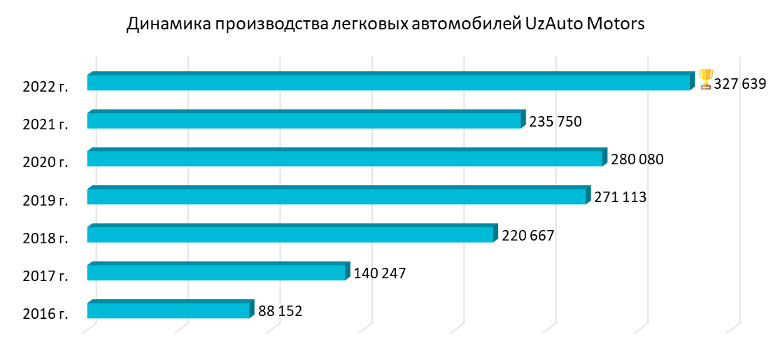 Наращивание объемов производства за счет модернизации и оптимизации производственных процессов позволили достичь исторических рекордов UzAuto Motors - с 2016 года объемы производства выросли на 269%. Внедрение новых технологий производства, обновление оборудования и повышение компетенций кадров из лидера Средней Азии превратили в UzAuto Motors автомобильного гиганта стран СНГ.
