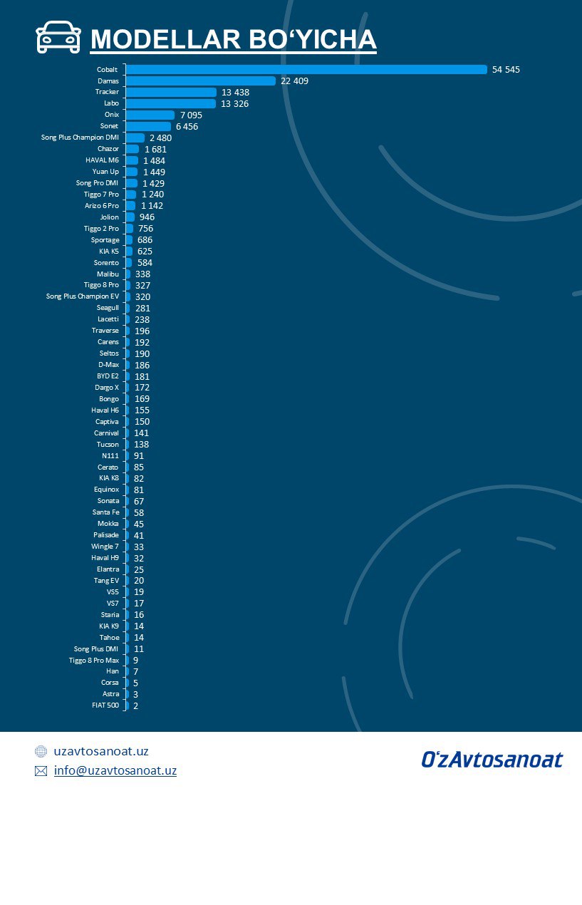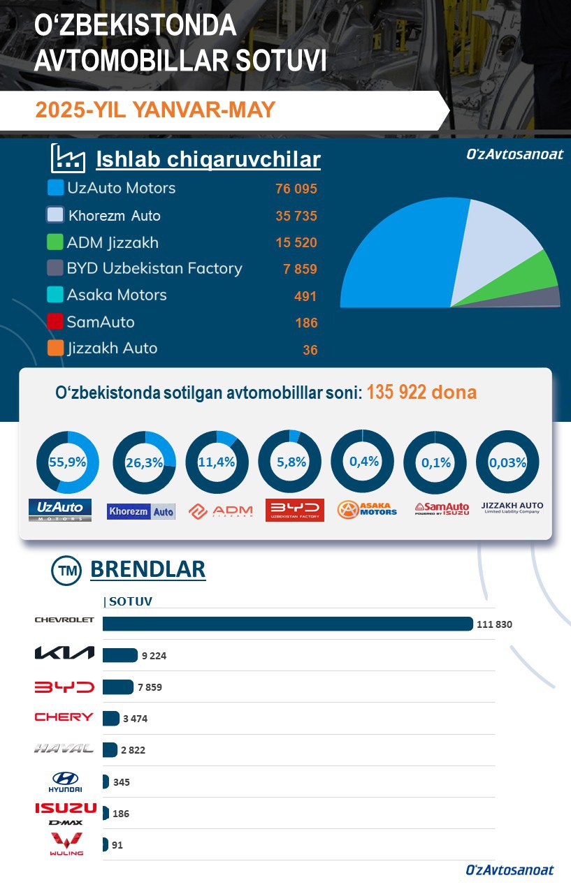 ✅ UzAuto Motors: 76 095✅ Khorezm Auto: 35 735✅ ADM Jizzakh: 15 520✅ BYD Uzbekistan: 7 859✅ Asaka Motors: 491✅ SamAuto: 186✅ Jizzakh Auto: 36