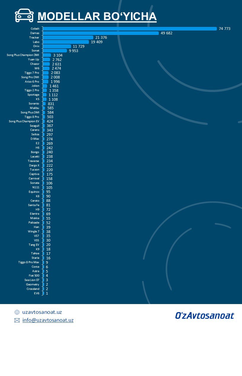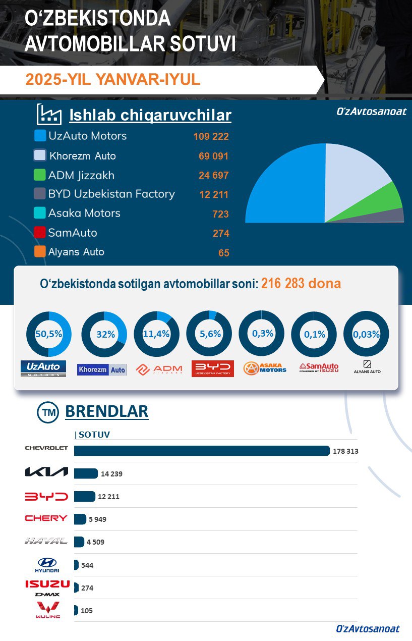 ✅ UzAuto Motors: 109 222✅ Khorezm Auto: 69 091✅ ADM Jizzakh: 24 697✅ BYD Uzbekistan: 12 211✅ Asaka Motors: 723✅ SamAuto: 274✅ Jizzakh Auto: 65