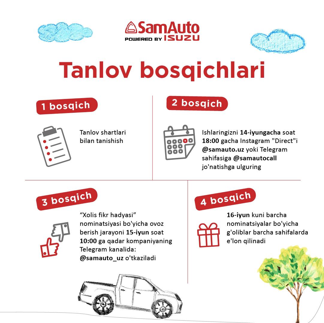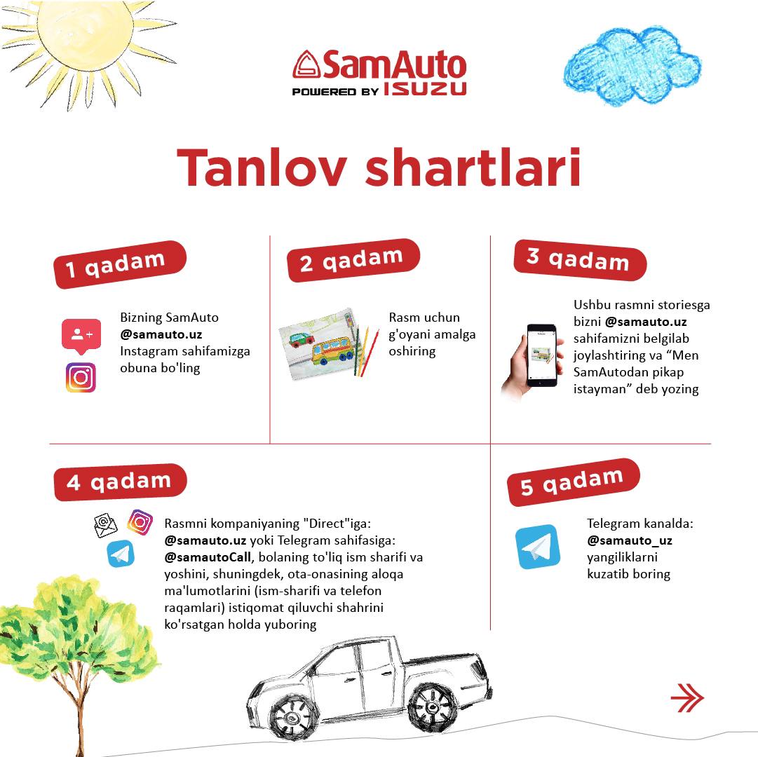 2️⃣ Все рисунки будут опубликованы в Telegram-канале: @samauto_uz.
