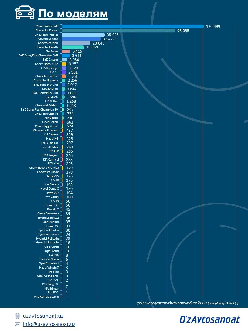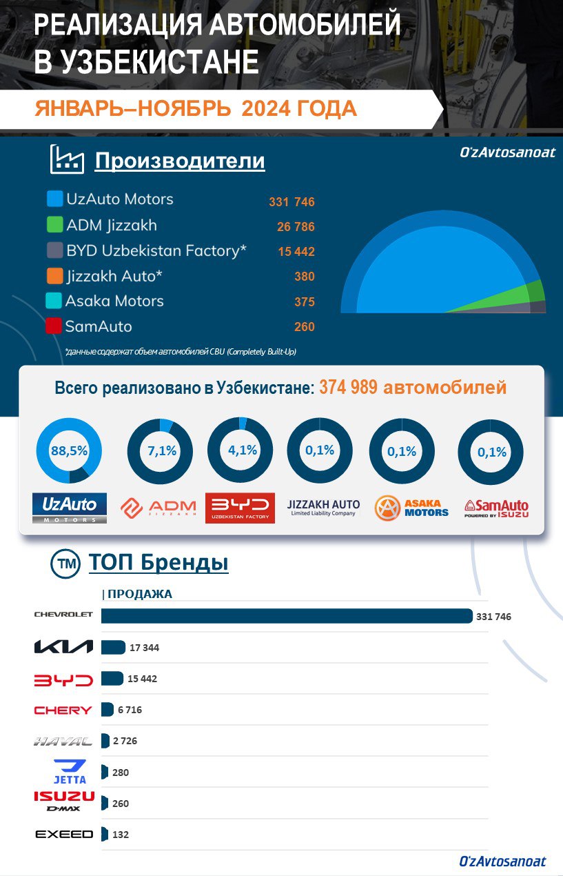 ✅ UzAuto Motors — 331 746✅ ADM Jizzakh — 26 786✅ BYD Uzbekistan Factory* — 15 442✅ Jizzakh Auto* — 380✅ Asaka Motors — 375✅ SamAuto — 260
