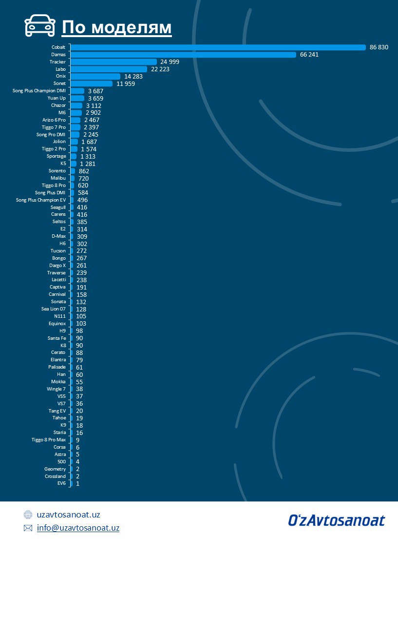 ✅ UzAuto Motors: 127 622✅ Khorezm Auto: 88 464✅ ADM Jizzakh: 29 193✅ BYD Uzbekistan: 14 721✅ Asaka Motors: 829✅ SamAuto: 309✅ Jizzakh Auto: 73